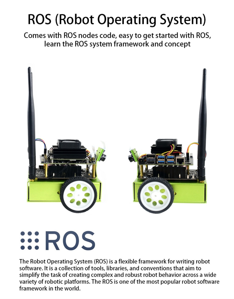 Welcome the JetBot, an actual smart robot powered by Jetson Nano. With the intelligent eye (front camera), facial recognition, object tracking, auto line following, and collision avoidance can be easily achieved. It also comes with ROS nodes code, which makes it easy to get started with the open source ROS (Robot Operating System), and to learn the system framework and concepts of ROS.