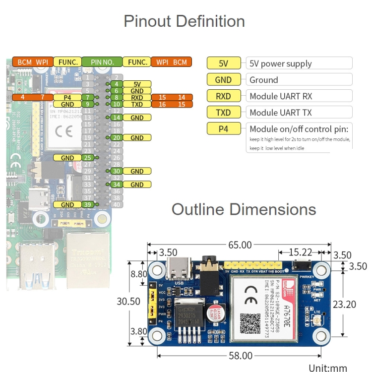 | Option | 4G / 3G / 2G / GSM / GPRS / GNSS HAT, 4G / 3G / GNSS HAT, NB-IoT / eMTC / EDGE / GPRS / GNSS HAT, NB-IoT HAT, GSM/GPRS/GNSS/Bluetooth HAT, A7670E LTE Cat-1 HAT |