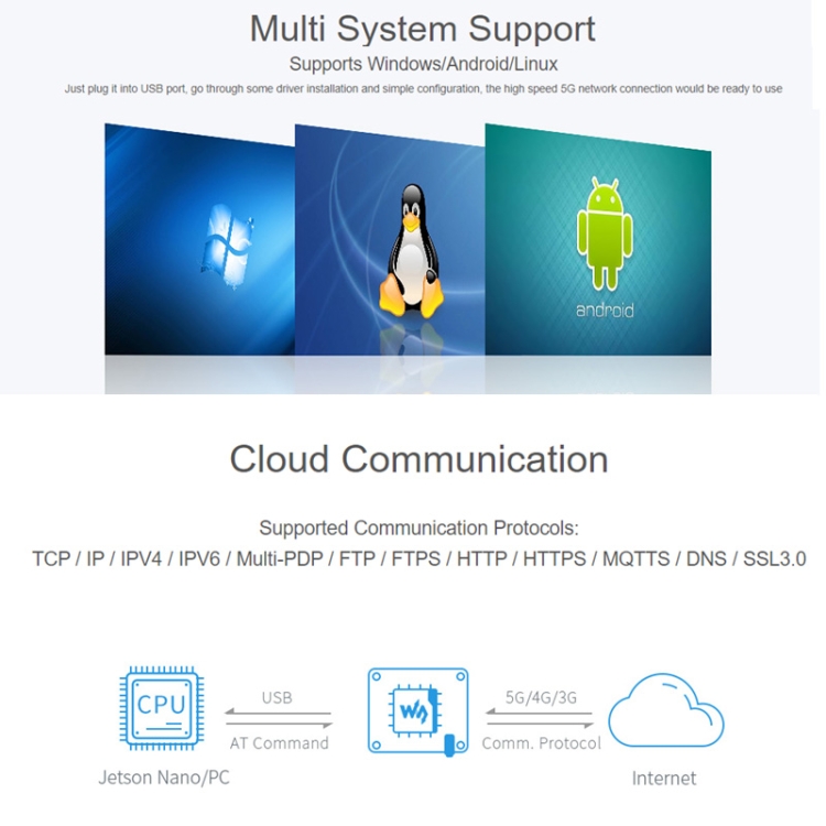 – Communication protocols: TCP/IP, IPV4, IPV6, Multi-PDP, FTP, FTPS, HTTP, HTTPS, MQTTS, DNS, SSL3.0