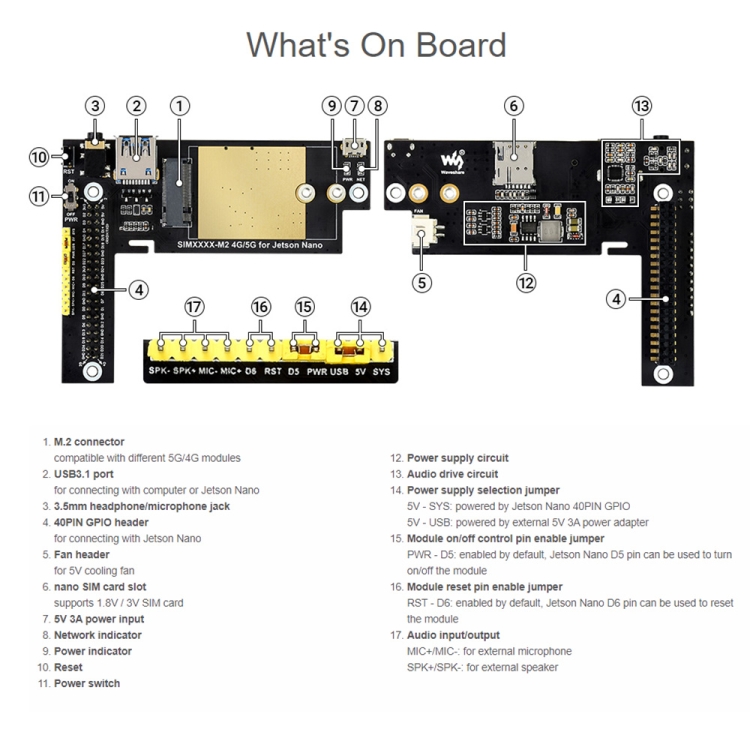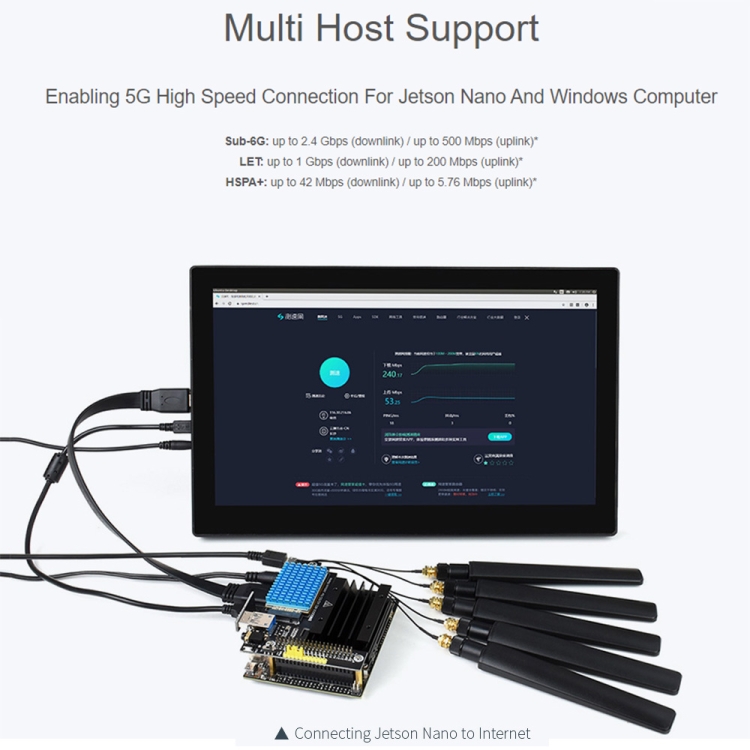 This 5G/4G/3G Jetson Nano communication module adopts SIMCom 5G module SIM8200EA-M2, supports 5G NSA and SA networking, providing data rate up to 2.4 Gbps (DL) / 500 Mbps (UL).