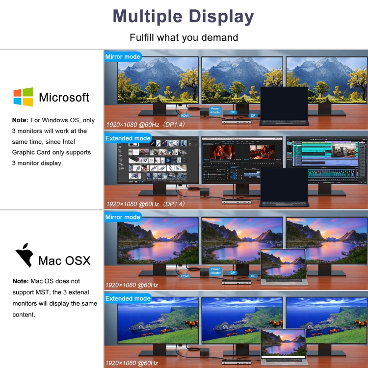 8. HD2.0x1, DP1.4×2: Triple Display: 1920×1080 60Hz (HBR3 DP 1.4), Dual display: 3840×2160 60Hz(HBR3 DP 1.4), Single display: 3840×2160 60Hz (HBR3 DP 1.4)