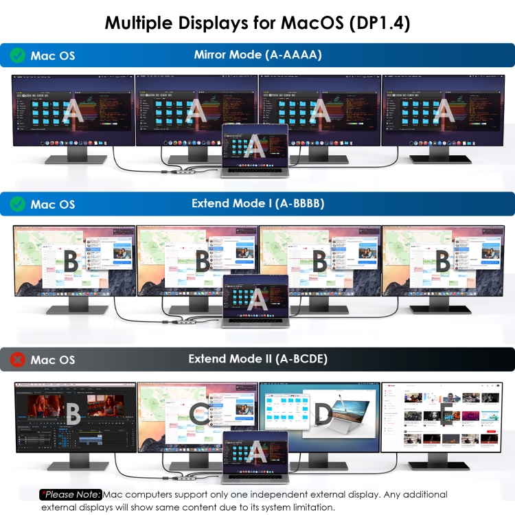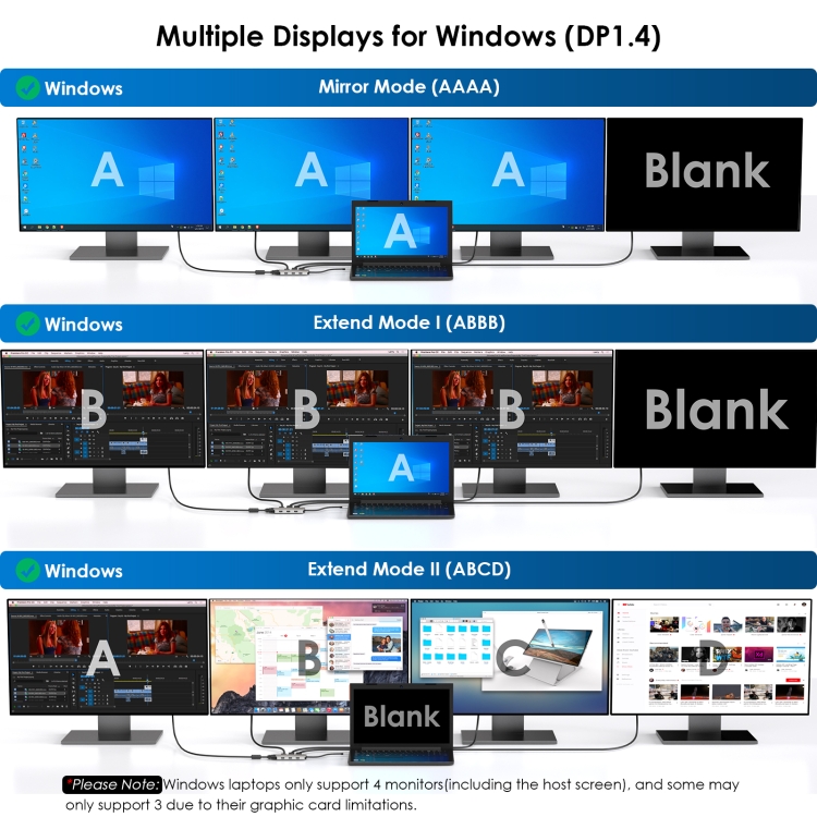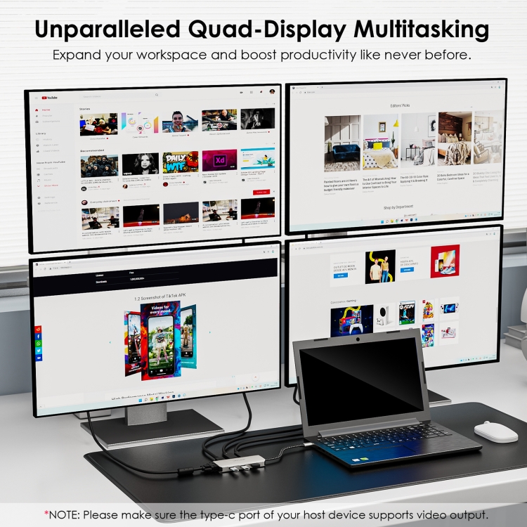 2. Quad Display is authorized to work: Connect up to four monitors with 1080P@60Hz using 2DP, HDMI and VGA ports (under DP1.4), which is a great choice for multitasking and expanding your workspace. Imagine having multiple screens that allow you to have different applications, documents, or browser tabs open at the same time. Please note: Windows laptops support up to 4 monitors (including the host screen); macOS-based computers only support one external monitor with different content