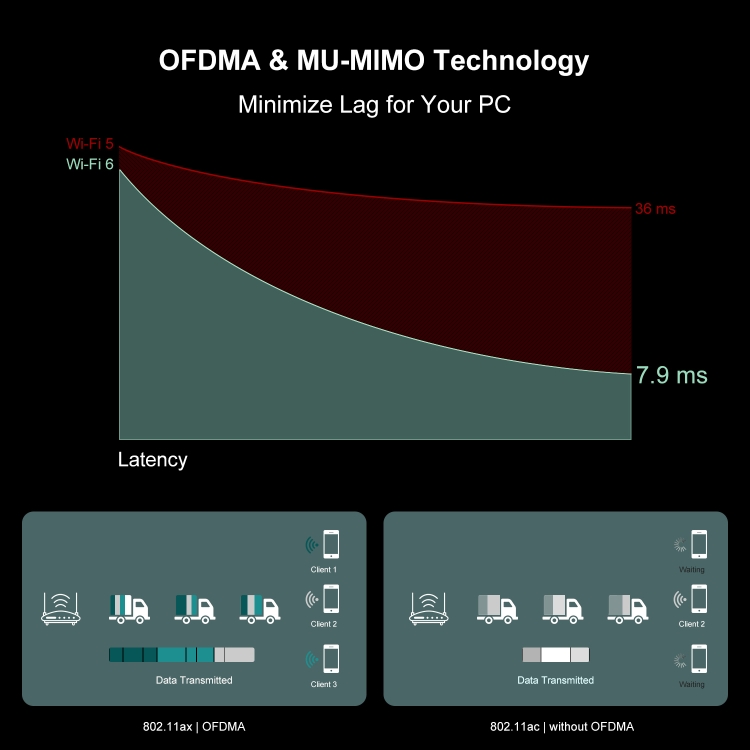 2.OFDMA ultra fast speed: The combination of MU-MIMO architecture and OFDMA technology ensures better stability and high-speed performance for your computer even in congested networks with multiple devices.