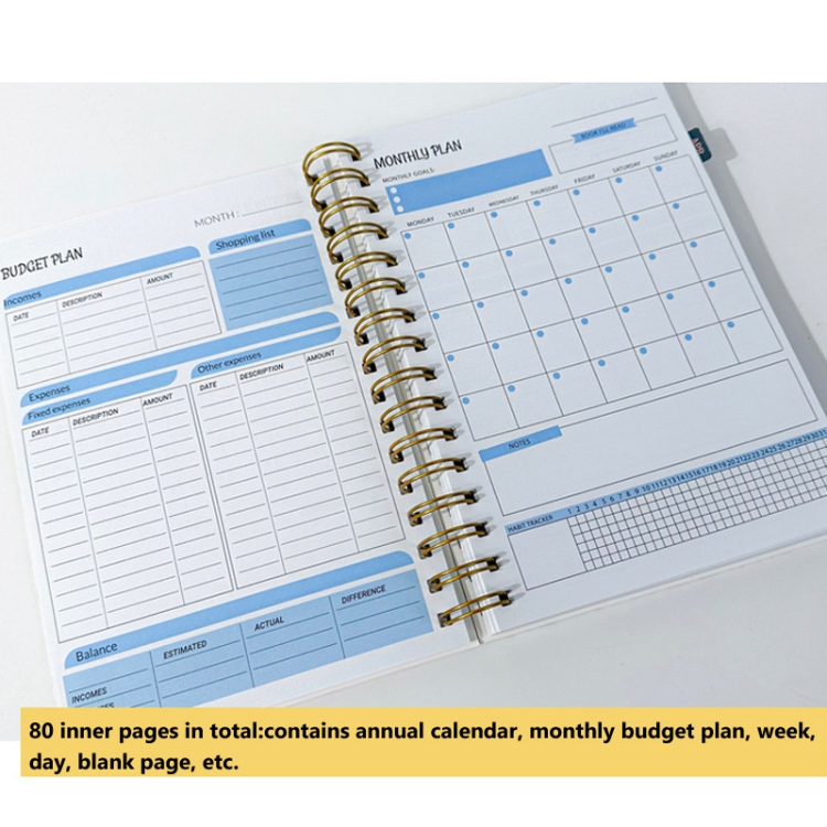 3. A total of 80 inner pages, including annual calendar, monthly budget plan, week, day, blank pages, etc.