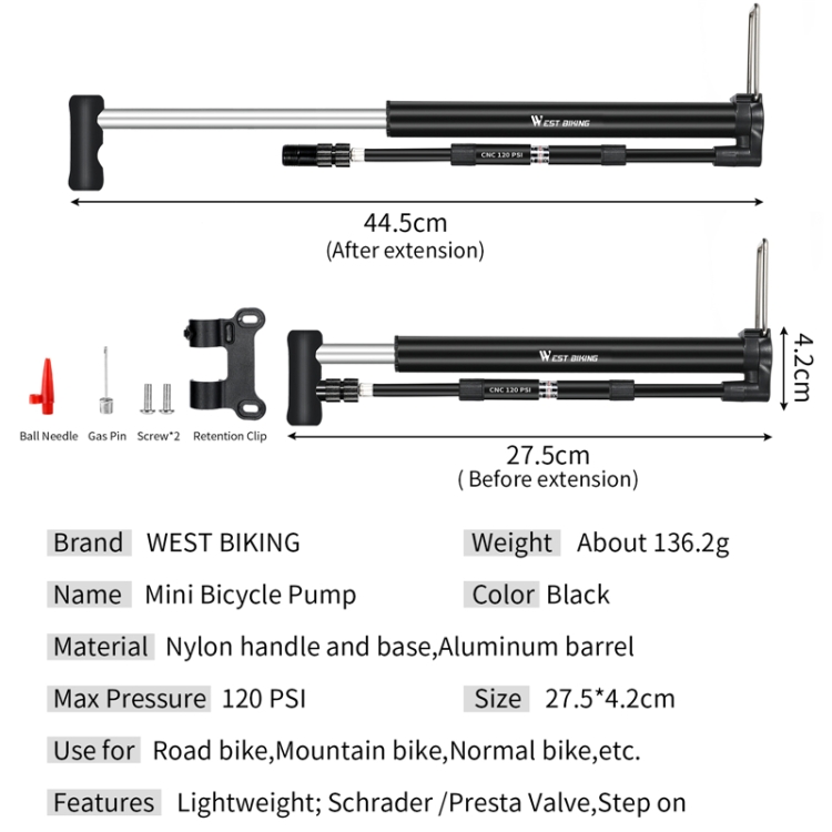 | Option | WHEEL UP Mini Pump, Black Without Gas Cylinder, West Biking Pump(Black), West Biking Vertical Pump, Aluminum Alloy Pump(Golden), CYCLINGBOX BG-1043(Green), CYCLINGBOX BG-1043(Orange) |