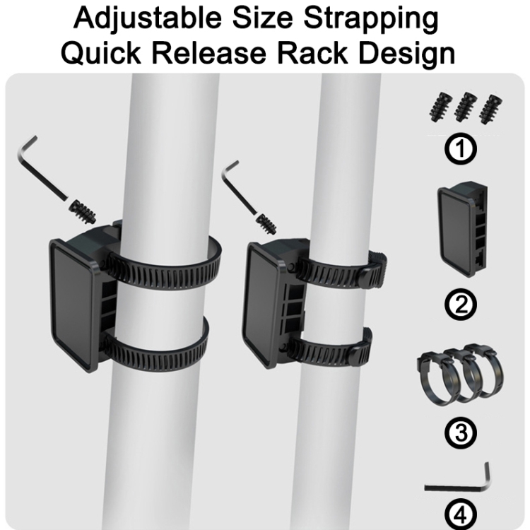 1. Adjustable size strap type quick release frame design, suitable for 20-45mm diameter size tube, can be adjusted according to the size of the tube