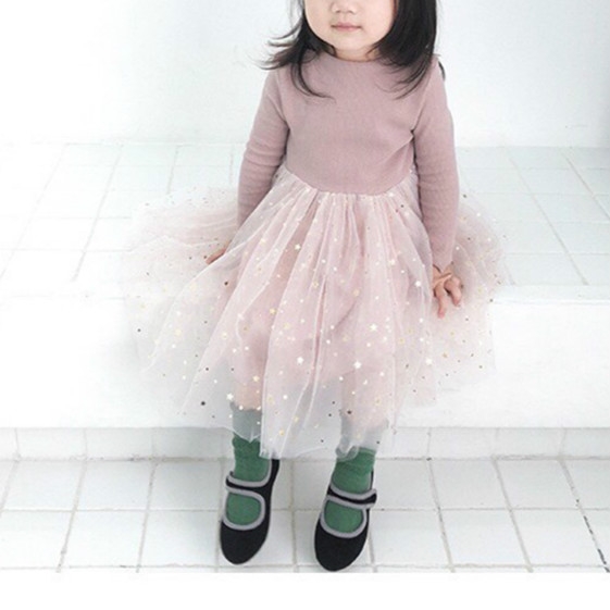 Winter Girls Patchwork Five-pointed Star Mesh Long-sleeved Dress, 73cm, 80cm, 90cm, 100cm, 110cm
