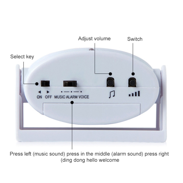 3 modes: Voice Alarm Music,at “Voice” mode: Human voice,dingdong,ninhao,huan ying guang ling;at “Alarm”mode: keeps you aware of intruders;at “Music” mode: just as a doorbell,with 32 music to welcome your guests