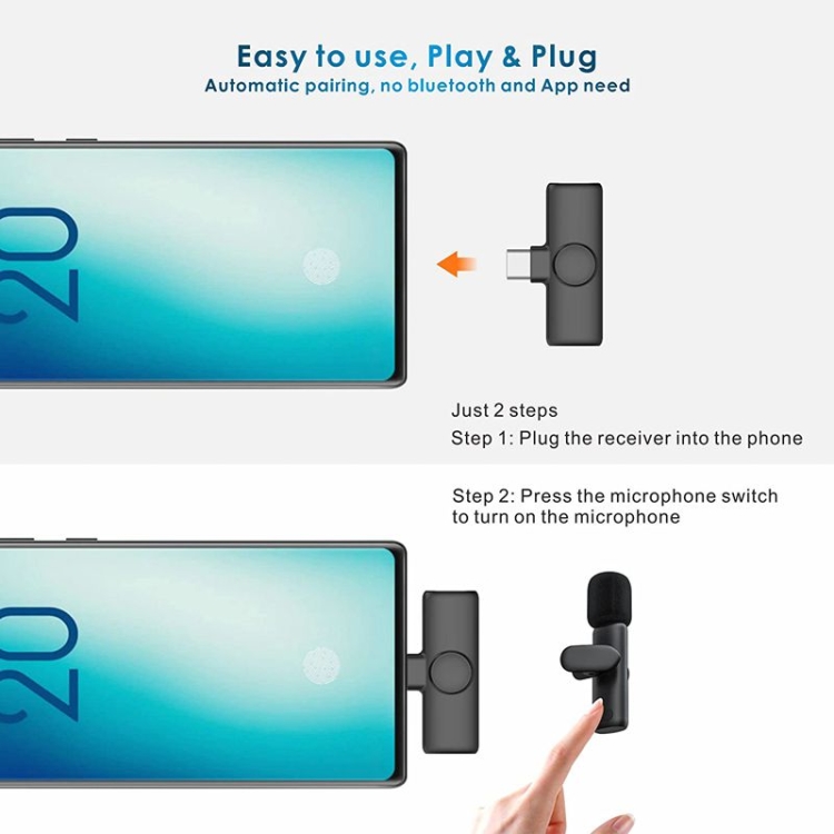2. Automatic Connection; Easy to use, No need APP and Bluetooth required, Just plug the receiver into your device (with USB C interface) and turn on the mini microphpne, the receiver and Mic will pair automatically. Note: Make sure the USB OTG in your device is on