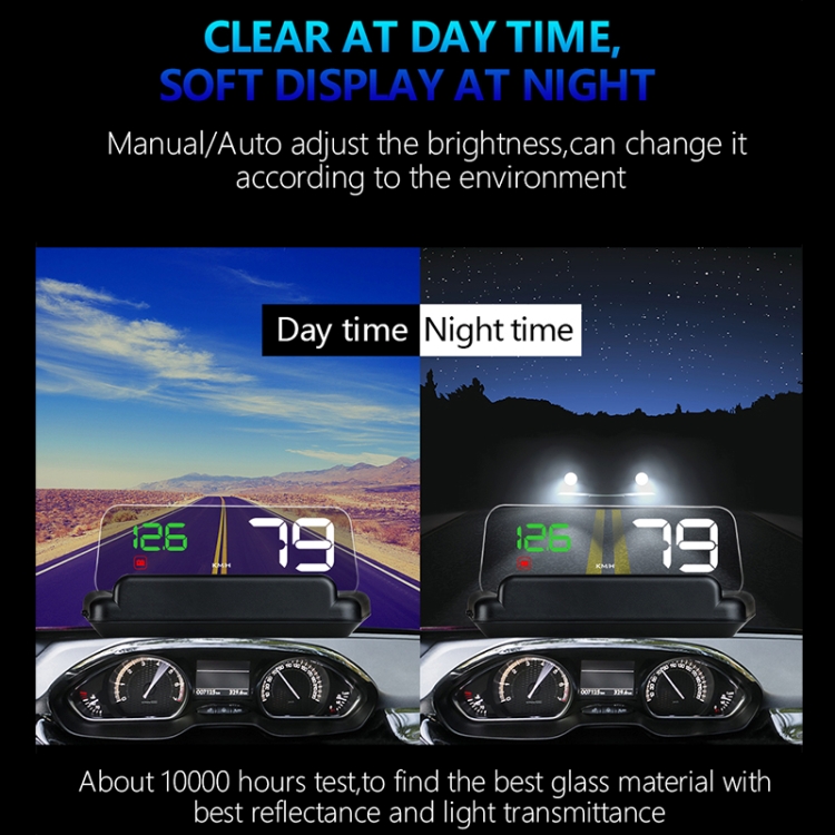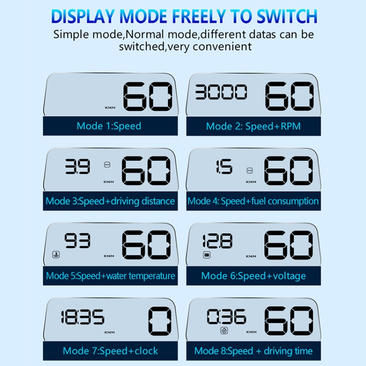 With Adjustable Reflection Board, Speed & RPM & Water Temperature & Oil Consumption & Driving Distance / Time & Voltage Display, Over Speed Alarm, Connect OBD2 Interface