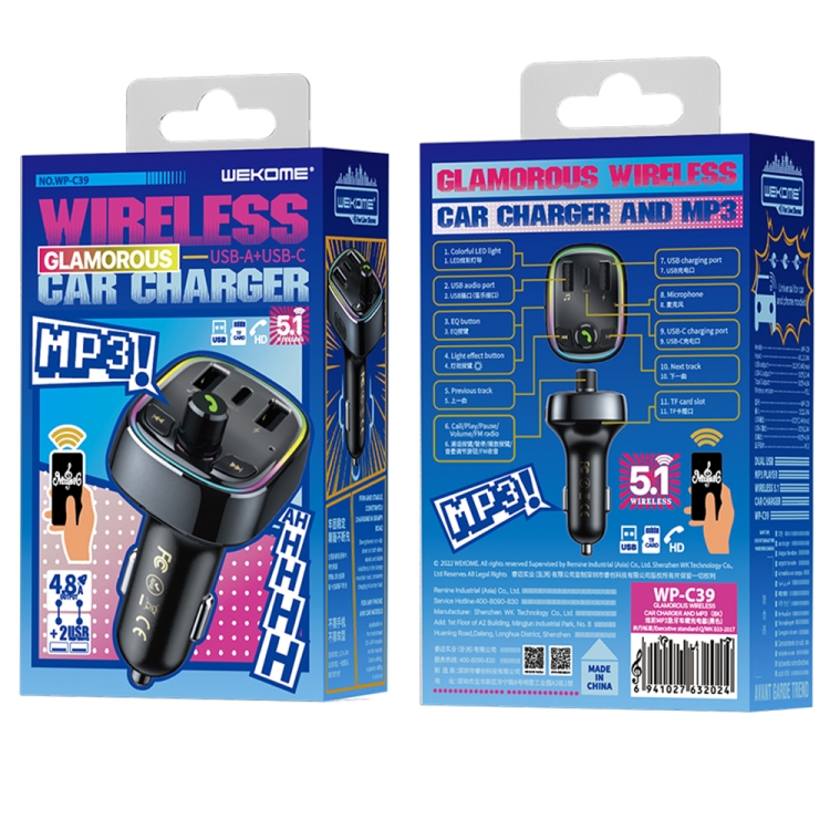 WK WP-C39 USB+USB-C/Type-C MP3 Bluetooth Car Fast Charger