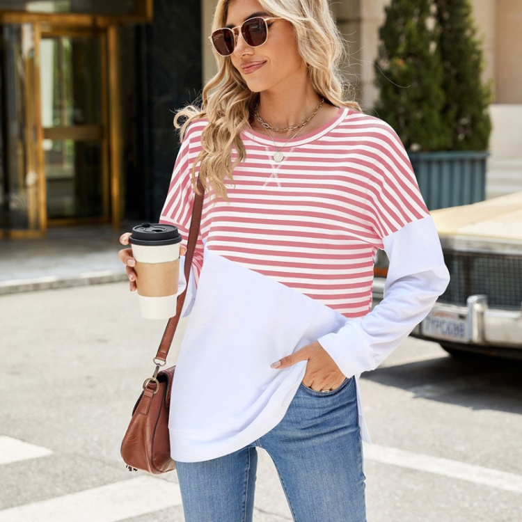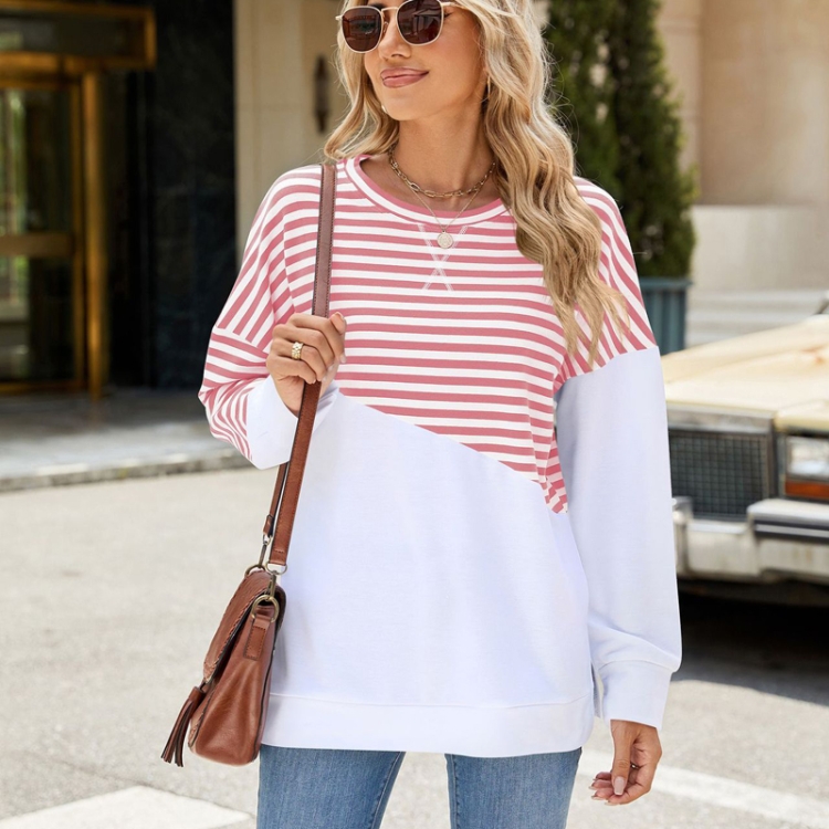 Women Casual Loose Fit Colorblock Striped Long Sleeve Sweatshirt Crew Neck Pullover Top for Fall Winter