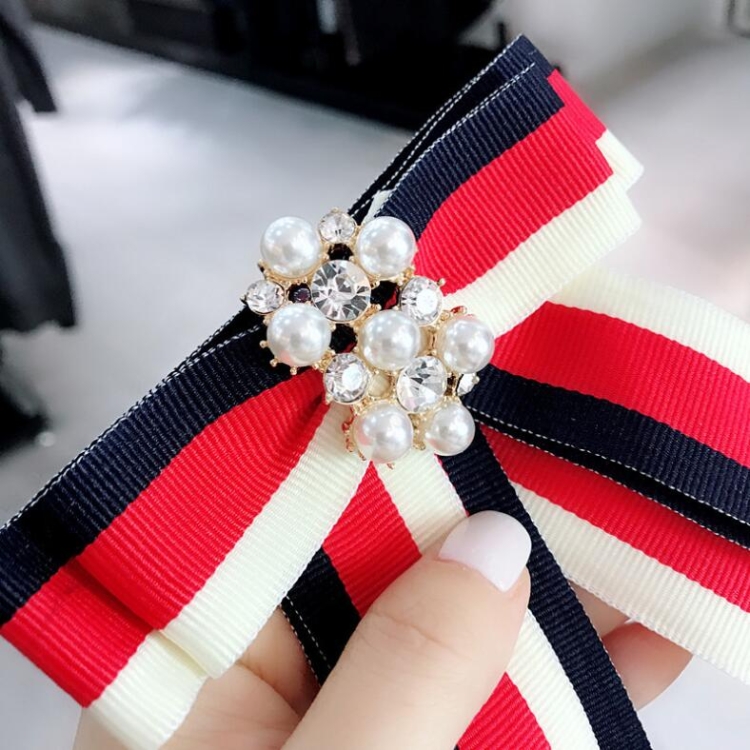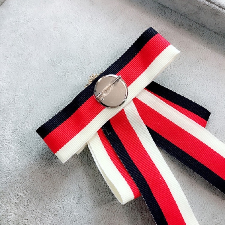Women College Style Stripe Ribbon Bow Tie Diamond Pearl Bow-knot Brooch Clothing Accessories
