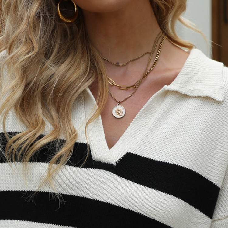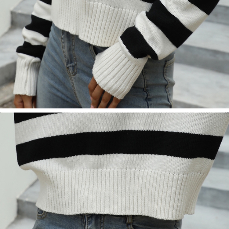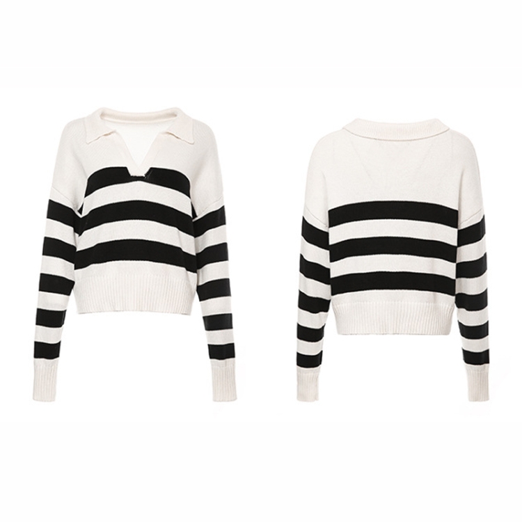 Women Lapel Cotton Knit Top Loose Stripes Hit Color Pullover Sweater