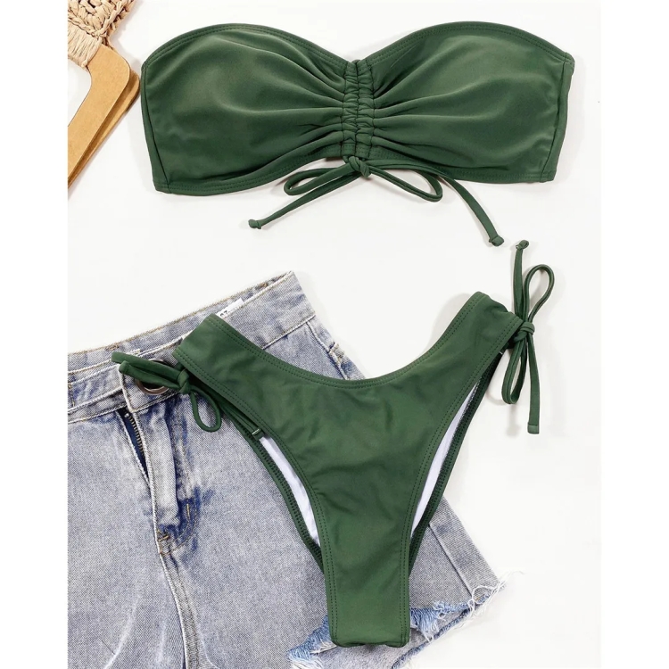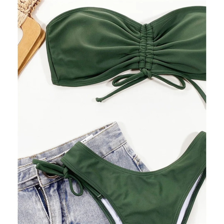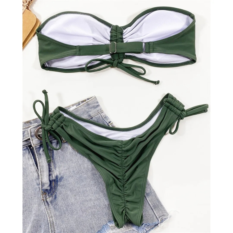 Women Sexy Lace Up Bandeau Two Pieces Set Bikini Drawstring Tie Side Swimsuit Swimwear