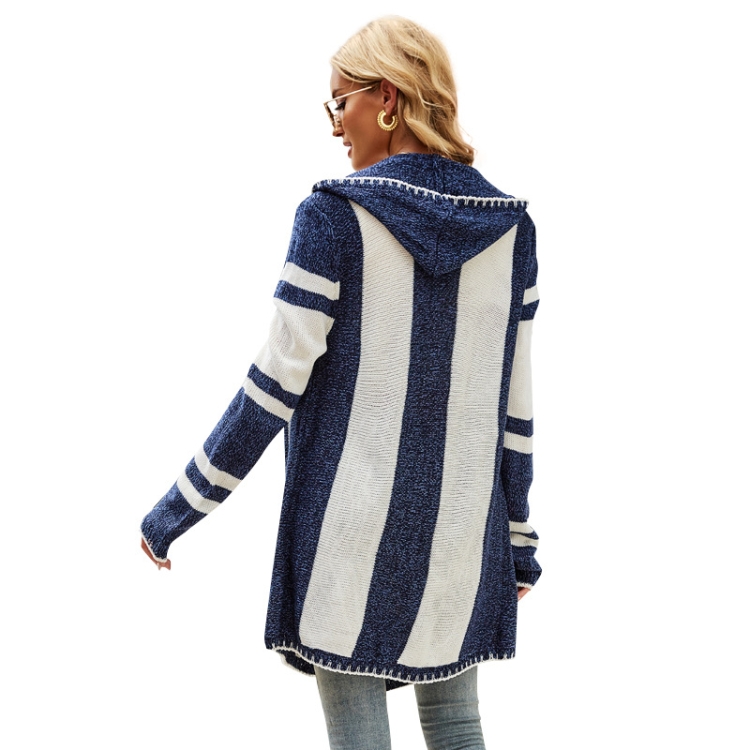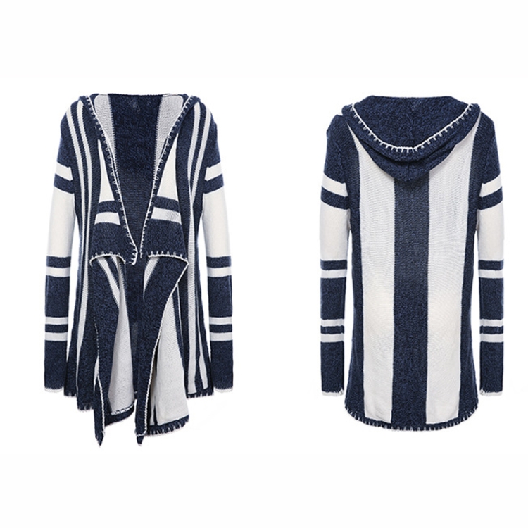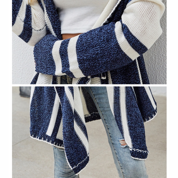 Women Striped Hooded Knit Cardigan Irregular Long-sleeved Sweater Jacket
