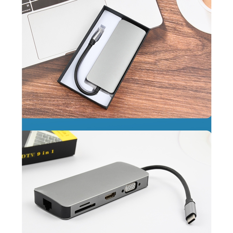 1. 9-in-1 interface: Type-c to PD+HDMI+SD+TF+Audio+RJ45+VGA+2 x USB3.0.