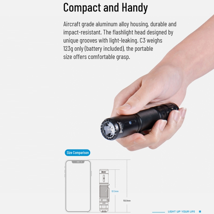 2. With 6 adaptive strong light modes: high/medium/low/Eco/strobe/SOS, the duration is up to 143 hours (Eco)