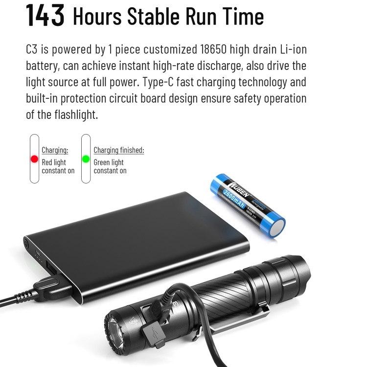 WUBEN C3 Outdoor Emergency Portable USB Rechargeable LED Strong Light Aluminum Alloy Flashlight