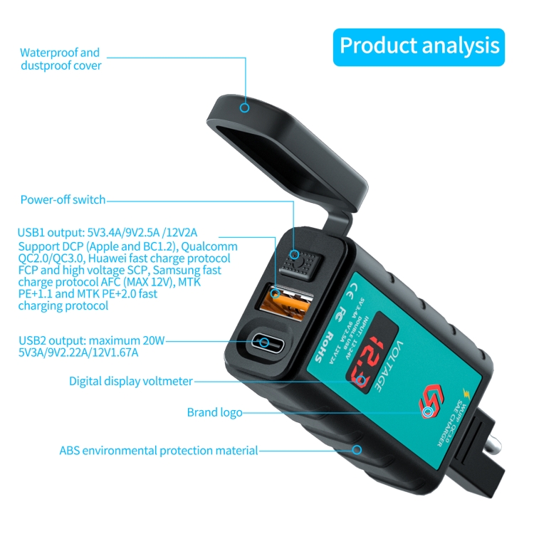 7. It can be installed on DC12V-24V vehicles, motorcycles, ATVs, SUVs, boats and other transportation tools, with a wide installation range; built-in power MOS, can provide 20W output power, and can automatically adjust the output voltage according to the fast charging protocol And current to adapt to the charging power of each mobile phone