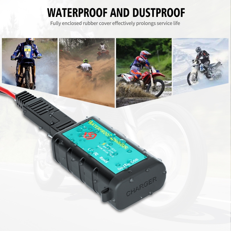 WUPP ZH-1422C1 Motorcycle Square Dual USB Fast Charging Charger with Switch + Integrated SAE Socket