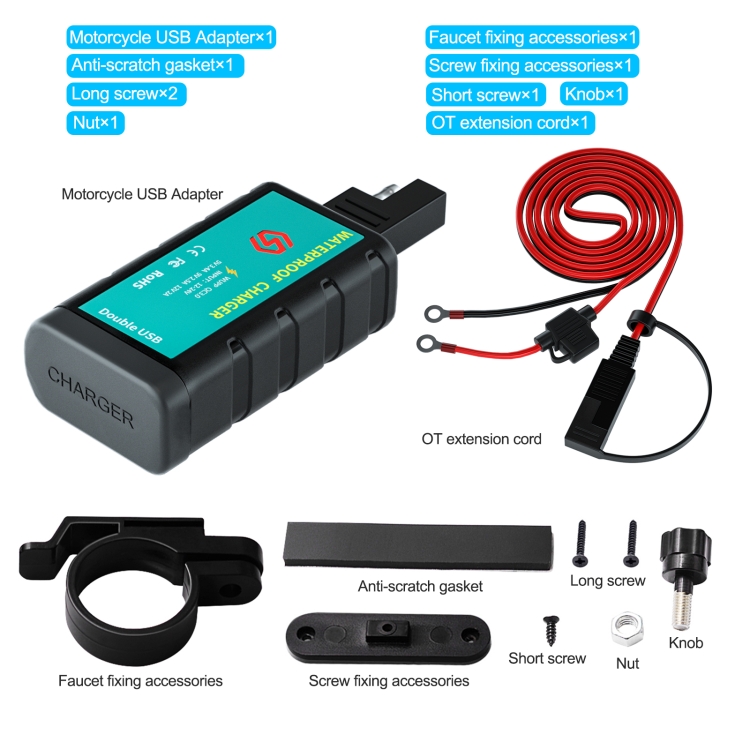 WUPP ZH-1422C3 Motorcycle Square Dual USB Fast Charging Charger with Switch + Integrated SAE Socket + 1.4m OT Terminal Cable