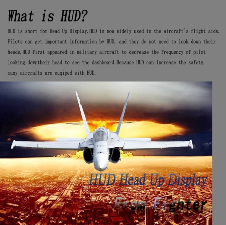 14. This product is for driversa?? safety, especially in high-speed driving at night, HUD can keep driver eyes on the road and can decrease car accident. HUD can project the important information (such as speed) onto the windshield, it can help inexperienced novice to control their speed and to avoid speeding violation in the speed limit road. More importantly, it enables the driver instantly read the number in great vision and always make drivers eyes on the road in clear mind.