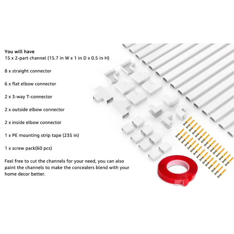 10. Package content: 15 x 2 channels, 8 x straight connectors, 6 x flat elbow connectors, 2 x 3-way T connectors, 2 external elbow connectors, 2 internal elbow connectors, 1 x PE installation strip (235 inches), 1 x screw pack (60 pcs)