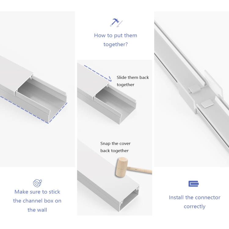 5. The 2 parts of the cable cover are firmly engaged with each other, so no matter where you install the cable trough, the internal cable can stay in place; you can easily slide it down and then click it back in a few minutes