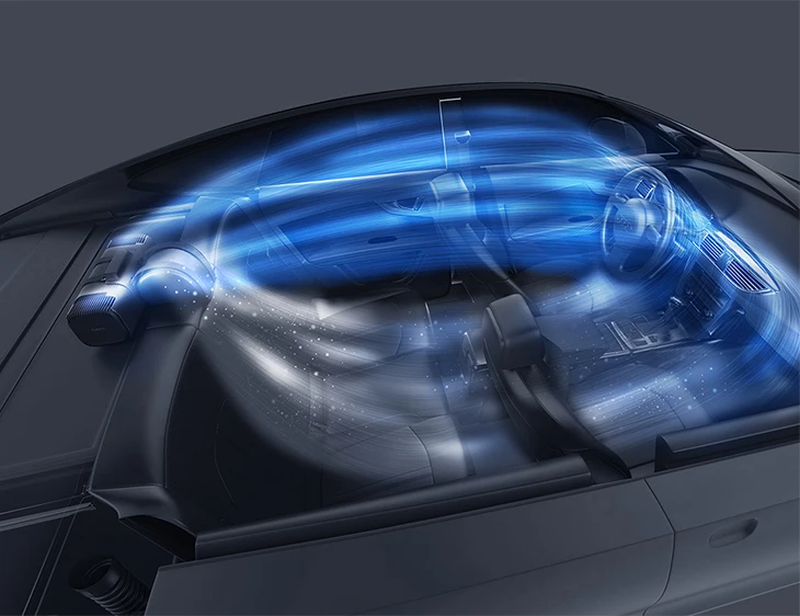 Three sides circulation wind inlet, increase the air intake area to make air inside the car fully cycled, improve the purification efficiency. Unique dual-mirror fan design fully optimizes the air duct curve to make air flow in the air output runs more smoothly. The air volume and the wind speed can also be sustained and stable when air pressure is increased.