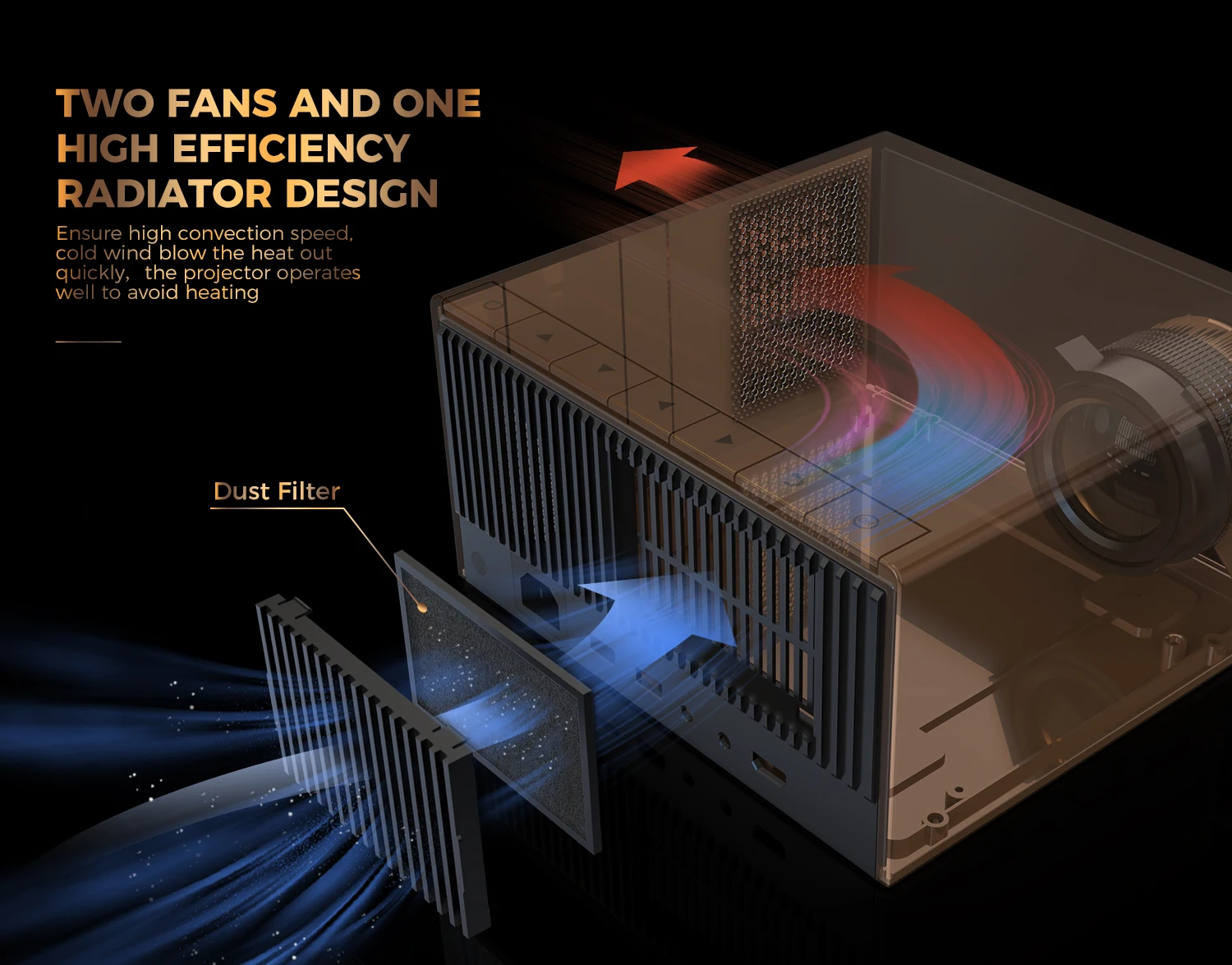 (Normally other projector sellers only have one cooling systems , convection design, fast heat dissipation, no need to worry about hot and turn off itself over long time playing .