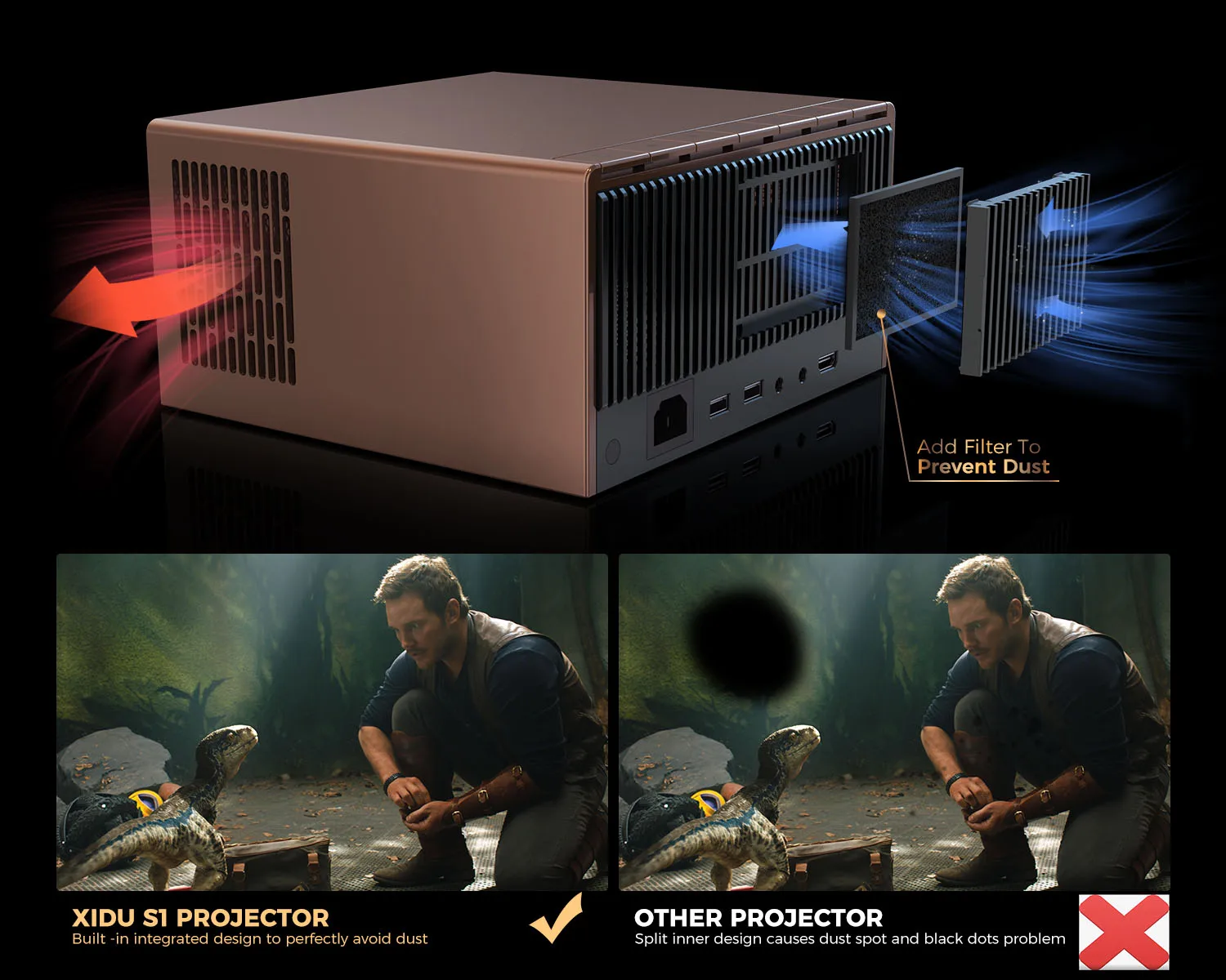 The higher the brightness of the bulb, the brighter and more beautiful the projected picture. Similarly, the brighter the bulb, the higher the heat emitted, Therefore, in order to maintain a good radiating, the speed of the fan is larger. In order to be perfectly compatible with high-brightness and low-noise fans and cooling, XIDU S1 uses an exclusive patented optical circuit design system to perfectly solve this problem. While maintaining high brightness, it can also meet the needs of achieving low noise and no hot.
