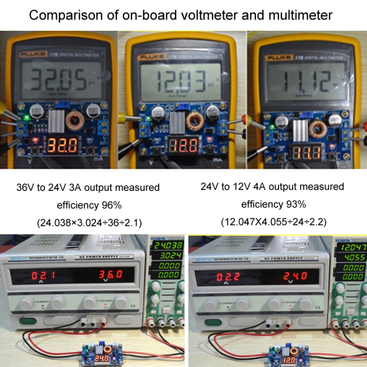 6. Adjustable output voltage range 1.25V-36V continuously adjustable (input voltage must be 1.5V higher than output voltage)