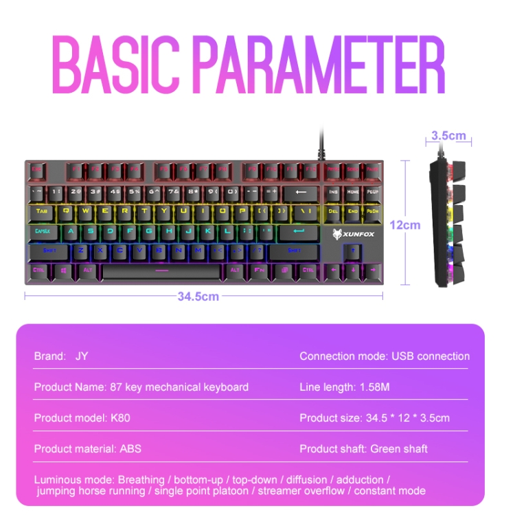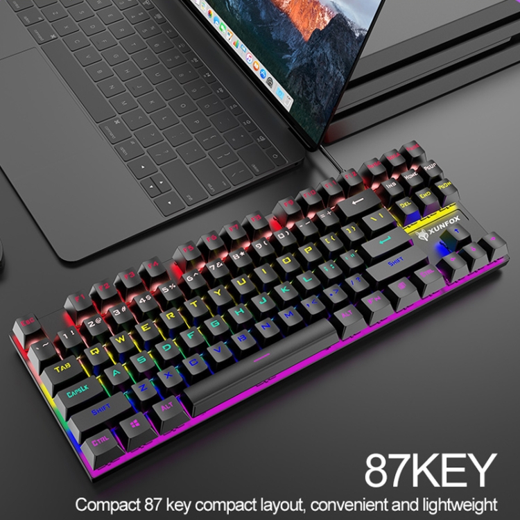 XUNFOX K80 87 Keys Wired Gaming Mechanical Illuminated Keyboard, Cable Length:1.5m