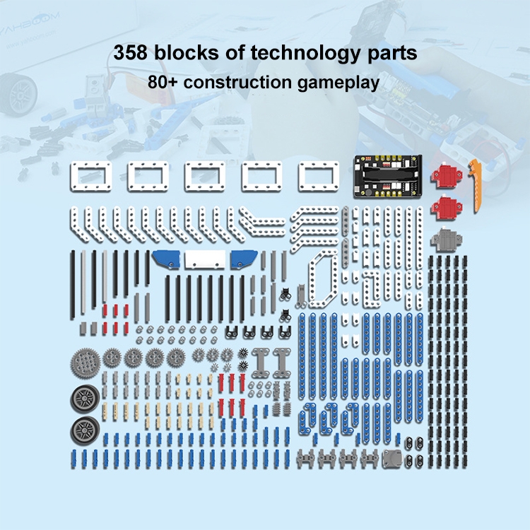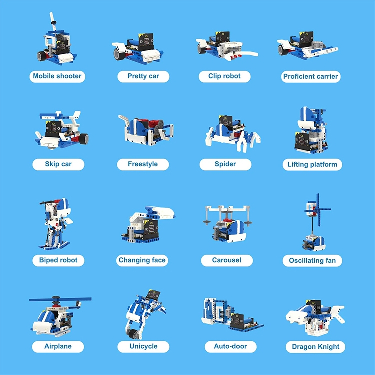 3. 16-in-1 superkit programmable building block kit is designed based on BBC Micro:bit, which is composed of Super:bit expansion board, building block servo, Building block motor, battery and 358 building block parts.