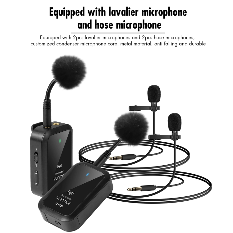 7. Equipped with two lavalier microphones and two hose microphones, customized condenser microphone core, metal material, anti-drop and durable
