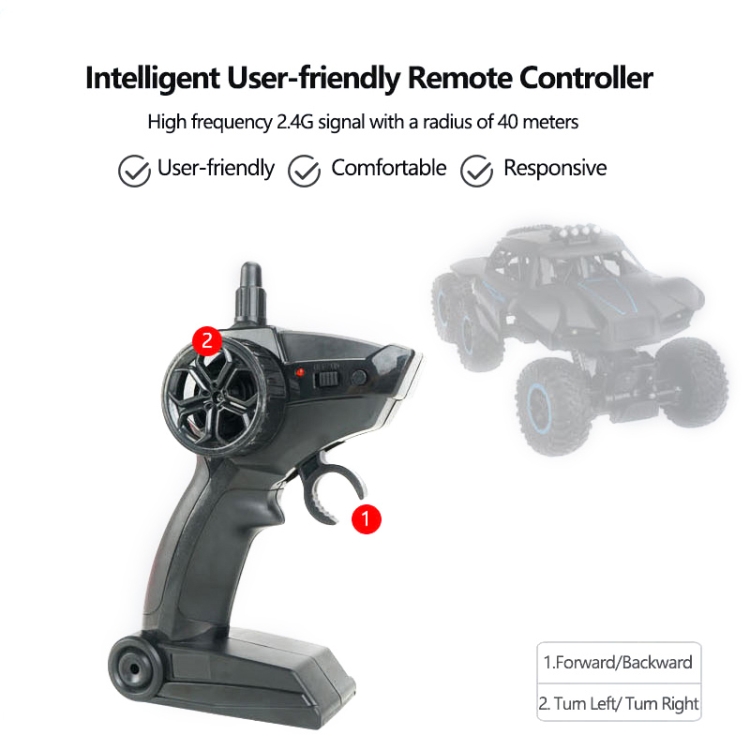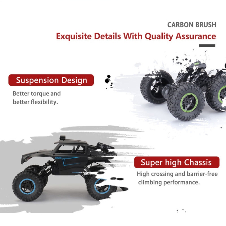9. 6WD remote control car equipped with shock absorbers and independent suspension system, high tenacity rubber tire, strong climbing performance, impact resistance and strong grip make it possible to overcome more difficult obstacles, to climb mountains, to run on the lawn or in the desert
