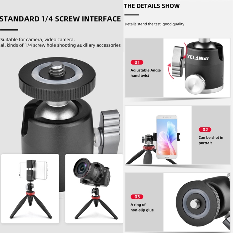 7. Standard 1/4 screw interface: Suitable for camera, video camera, all kinds of 1/4 screw hole shooting auxiliary accessories