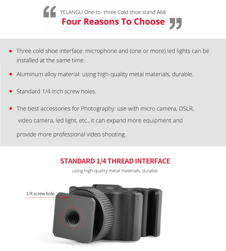 YELANGU YLG0601A A68 3-Head Cold Shoe Mount Adapter Microphone Flash Light Metal Holder Bracket
