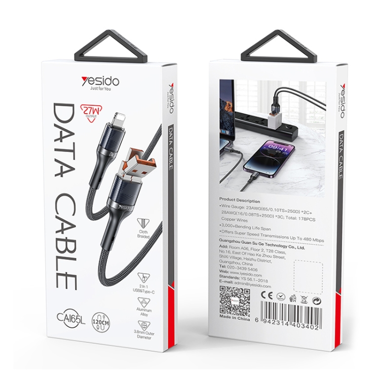 Yesido CA165L 27W USB + USB-C / Type-C to 8 Pin 2 in 1 Fast Charging Data Cable