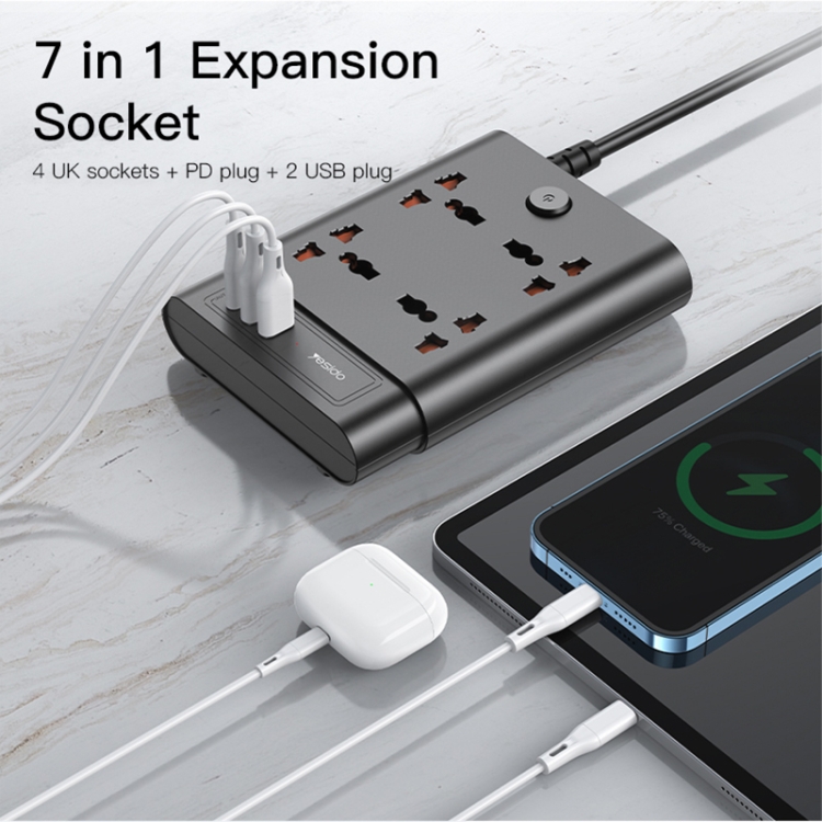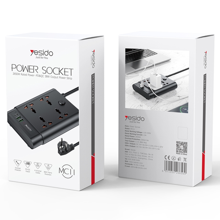 Yesido MC-11 4 Plugs + PD 20W+2 QC3.0 Ports 2650W Multi-functional High Power Socket