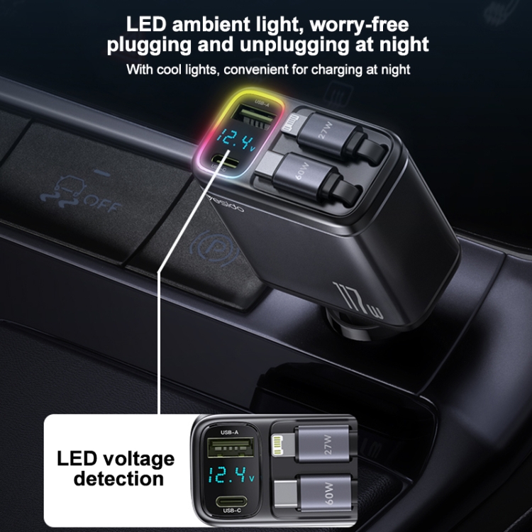 Yesido Y63 4 in 1 117W USB-C / Type-C+USB Multifunctional Retractable Dual Line Digital Display Car Fast Charger