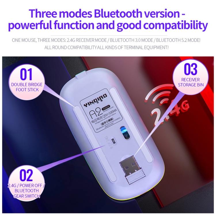 YINDIAO A2 BT3.0 + BT5.0 + 2.4GHz 1600DPI 3-modes Adjustable RGB Light Wireless Silent Bluetooth Mouse