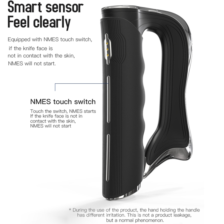 1. Touch the NMES touch switch through the palm of your hand, the blade touches the skin, and the micro current and motor vibration are activated at the same time. The muscles are repeatedly massaged to stimulate muscle contraction and increase muscle tension, thereby promoting blood circulation, reducing muscle pain, and accelerating muscle relaxation.