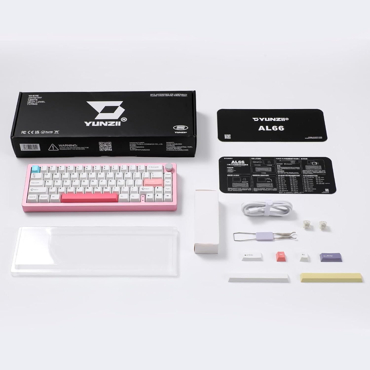 - 【Aluminium Gasket Mounted Mechanical Keyboard 】The YUNZII AL66 is a custom wireless mechanical keyboard that has 66 keys and 1 knob.With aluminum CNC machined body and gasket mount structure, the AL66 gaming keyboard is designed for premium typing comfort and top quality. The CNC aluminum keyboard takes Anodic Oxidation that can make the keyboard durable and corrosion-resistant,providing a better typing.