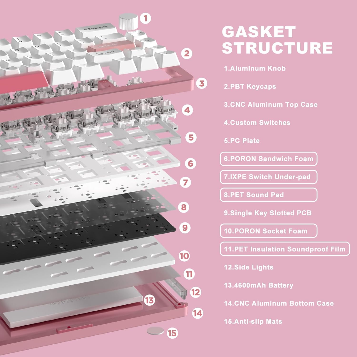 - 【Hot Swap Linear Milk Switch】YUNZII AL66 wireless mechanical keyboard utilizes a high-quality gasket material for solid typing sound. The hot swappable mechanical keyboard supports 3-pin or 5-pin mechanical switches.Equipped with poron sandwich foam, poron socket foam, PET sound pads, pre lubed swicthes and stabilizers,the keyboard provides pleasant typing feeling, ideal for gamers who like custom keyboard with superb quality.