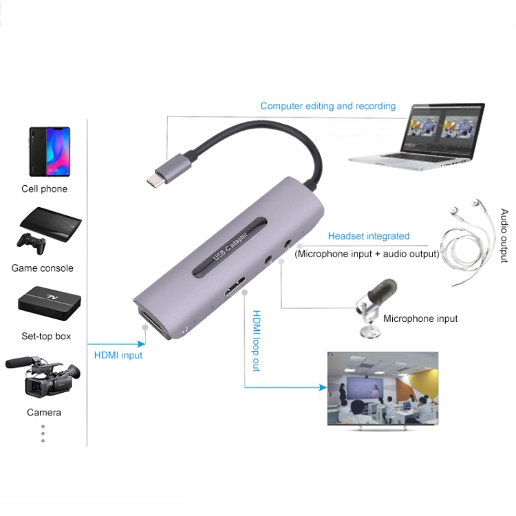 2.Supports operating systems such as Windows, Android, Linux, and MacOS; Supports microphone input, Built-in headphone compatible audio jack; Support HDMI local loop output; Supports most capture software, such as VLC, OBS, amcap .;