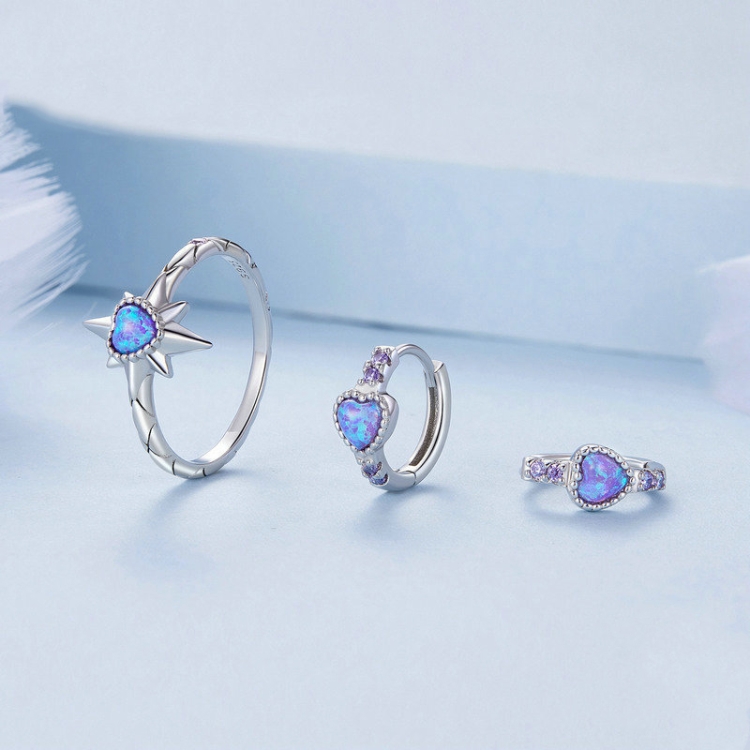 ZHS312 Sterling Silver S925 Platinum Plated Zircon Opal Earrings & Star Ring Set